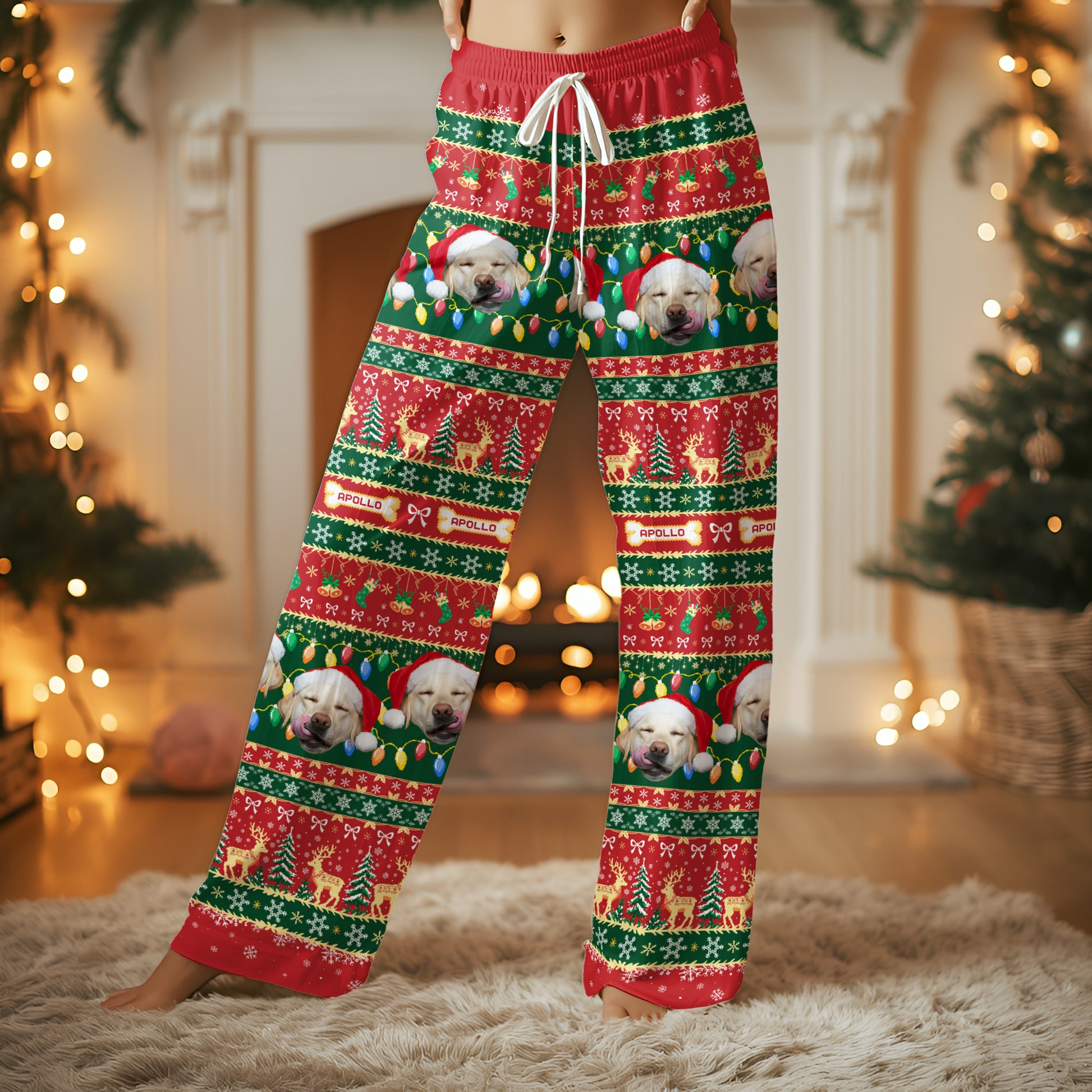 Custom Pet Christmas Lights Pajama Pants – Personalized Dog Photo & Name Holiday Lounge Bottoms