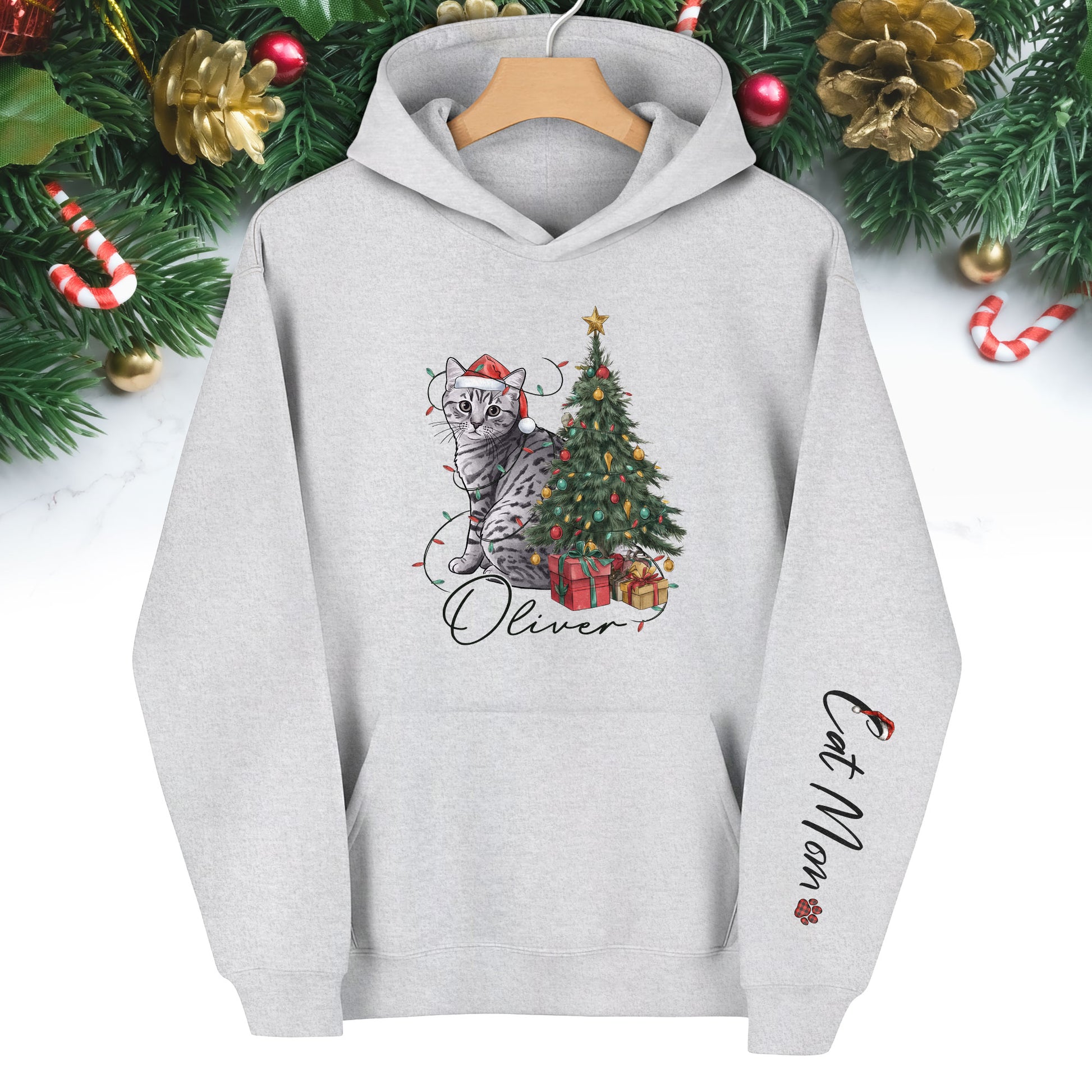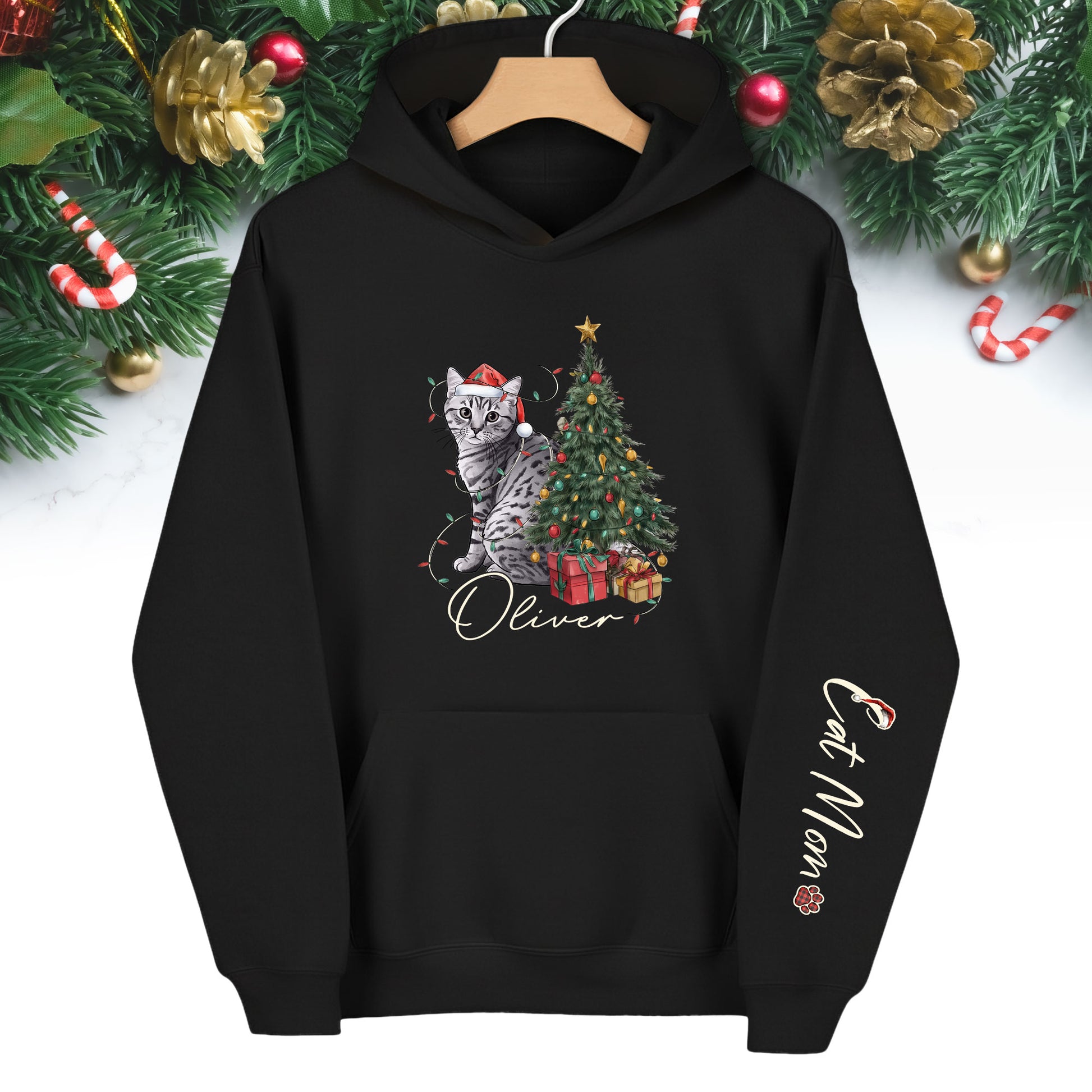 Personalized Cat Mom Christmas Hoodie – Custom Pet Photo Hoodie with Cat Name, Holiday Gift for Cat Lovers
